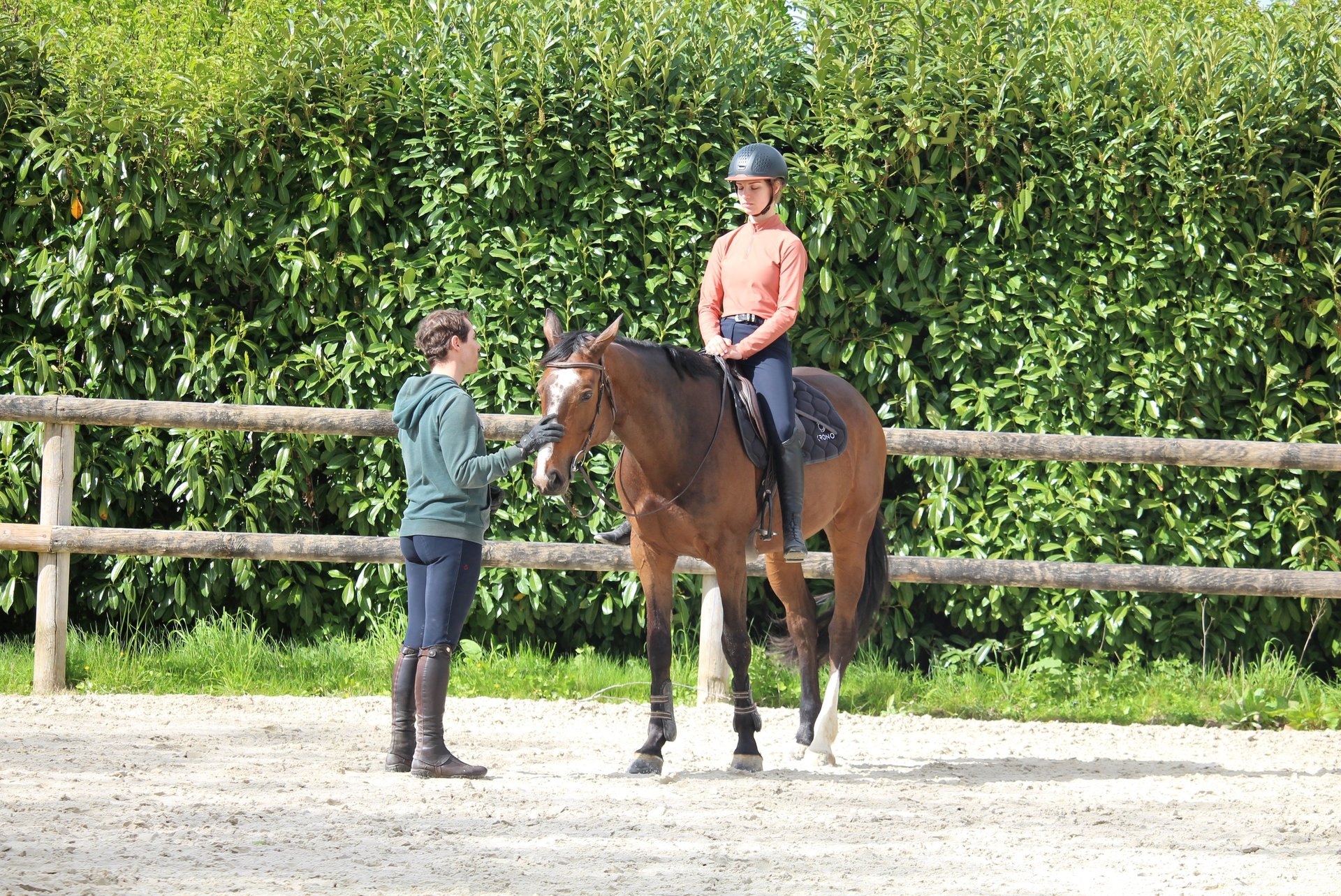 Lors des séances d'équitation sophrologique individuelles, l'enseignant tient le cheval pour les exercices de sophrologie et de pleine conscience réalisés les yeux fermés.